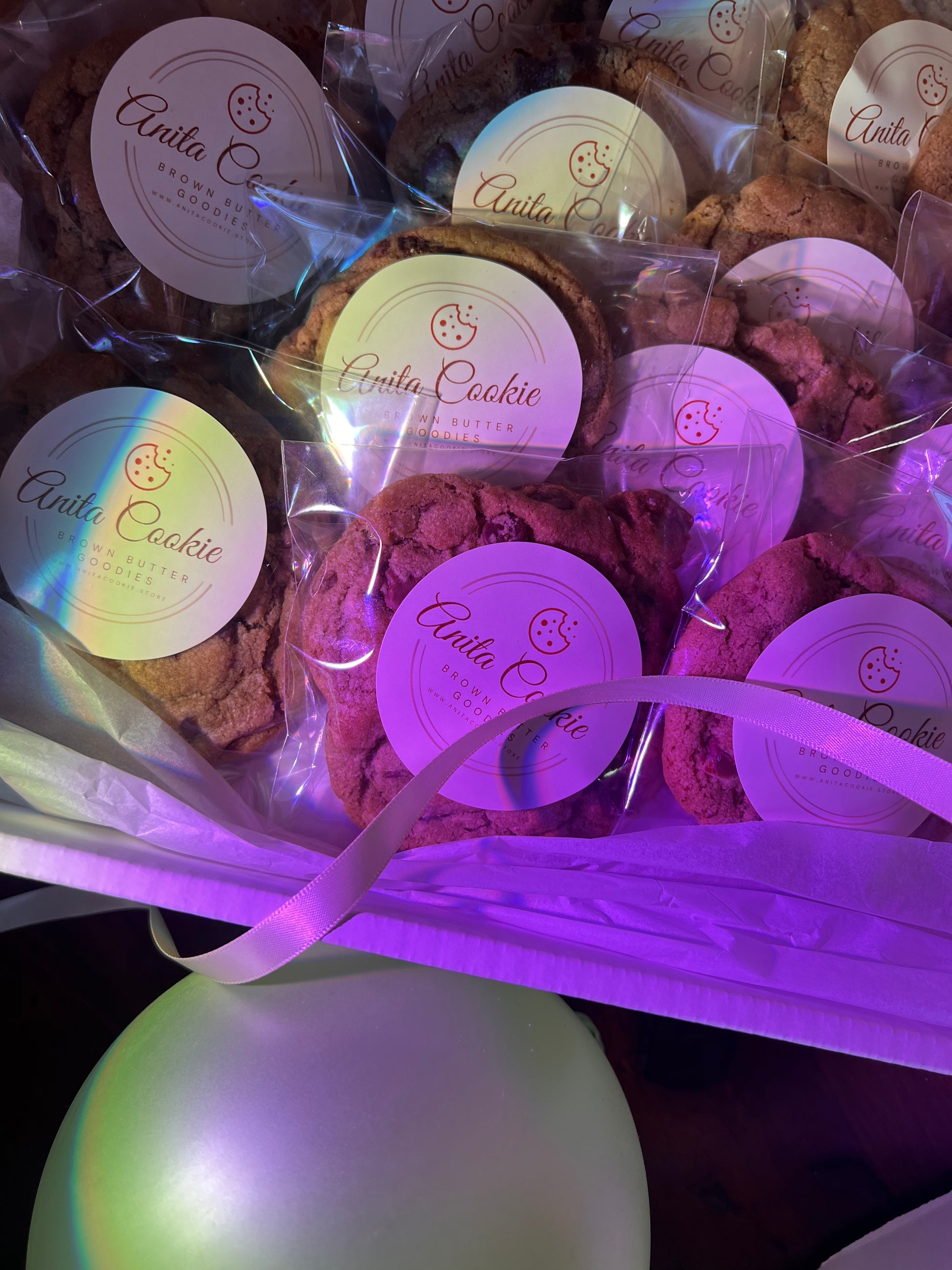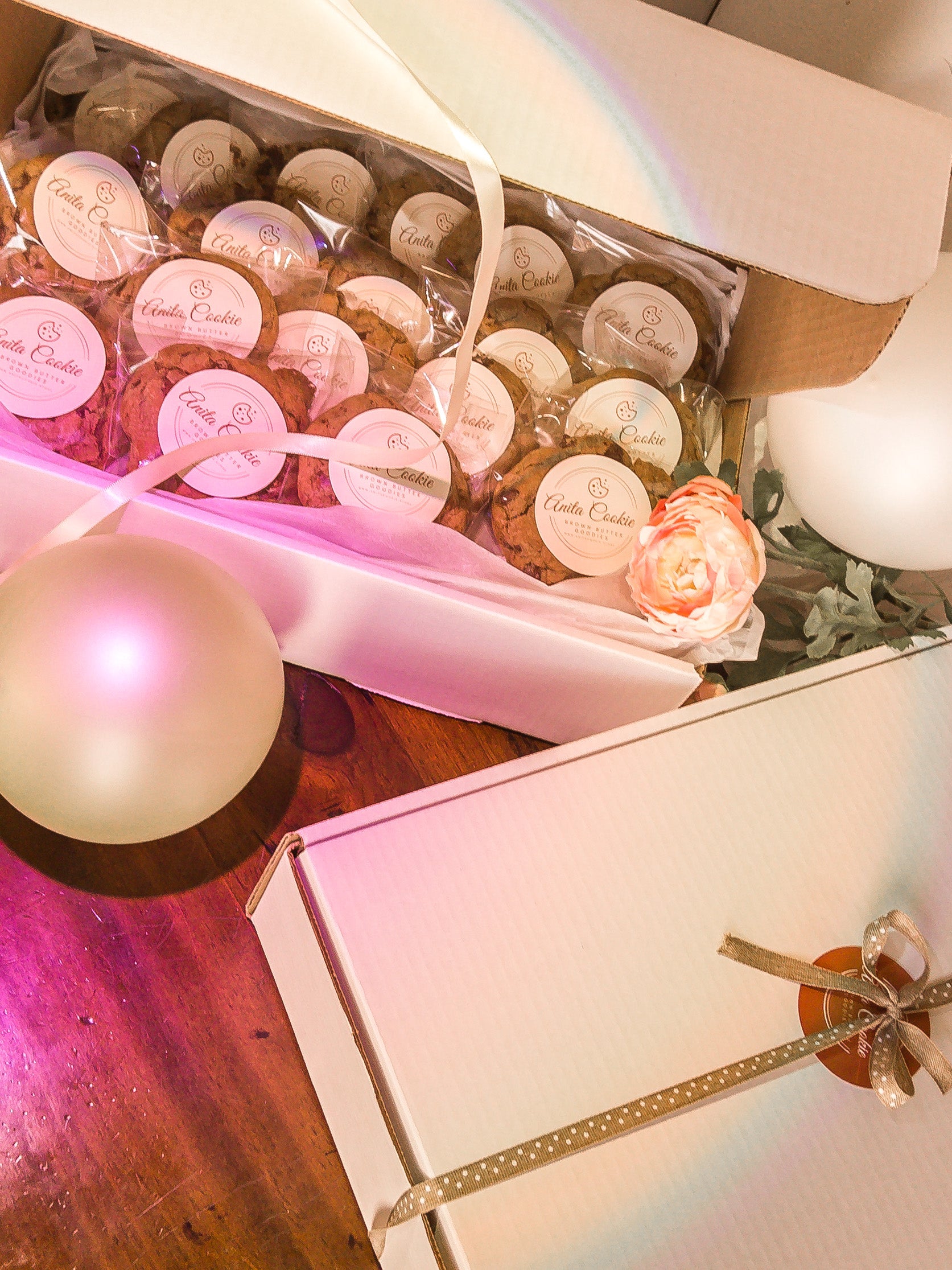 A box of 18 of our signature brown-butter goodies individually wrapped with a sticker personalized for your event. Each box includes 1 yard of ribbon and confetti.